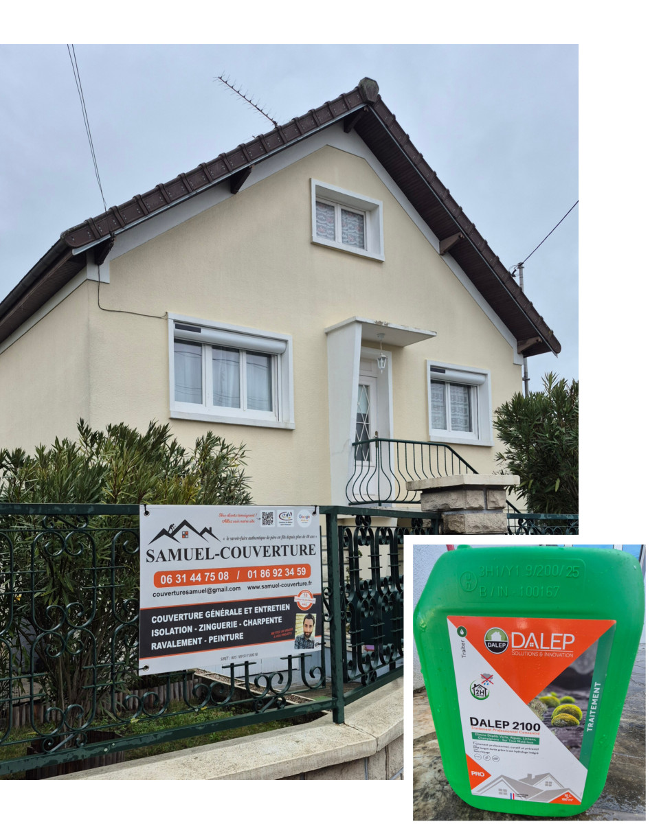 Cimentation du faitage ainsi que des pieds de cheminée fissuré, traitement de toiture par pulvérisation du traitement DALEP 2100 ( nettoyant anti-mousse curatif et préventif et hydrofuge )