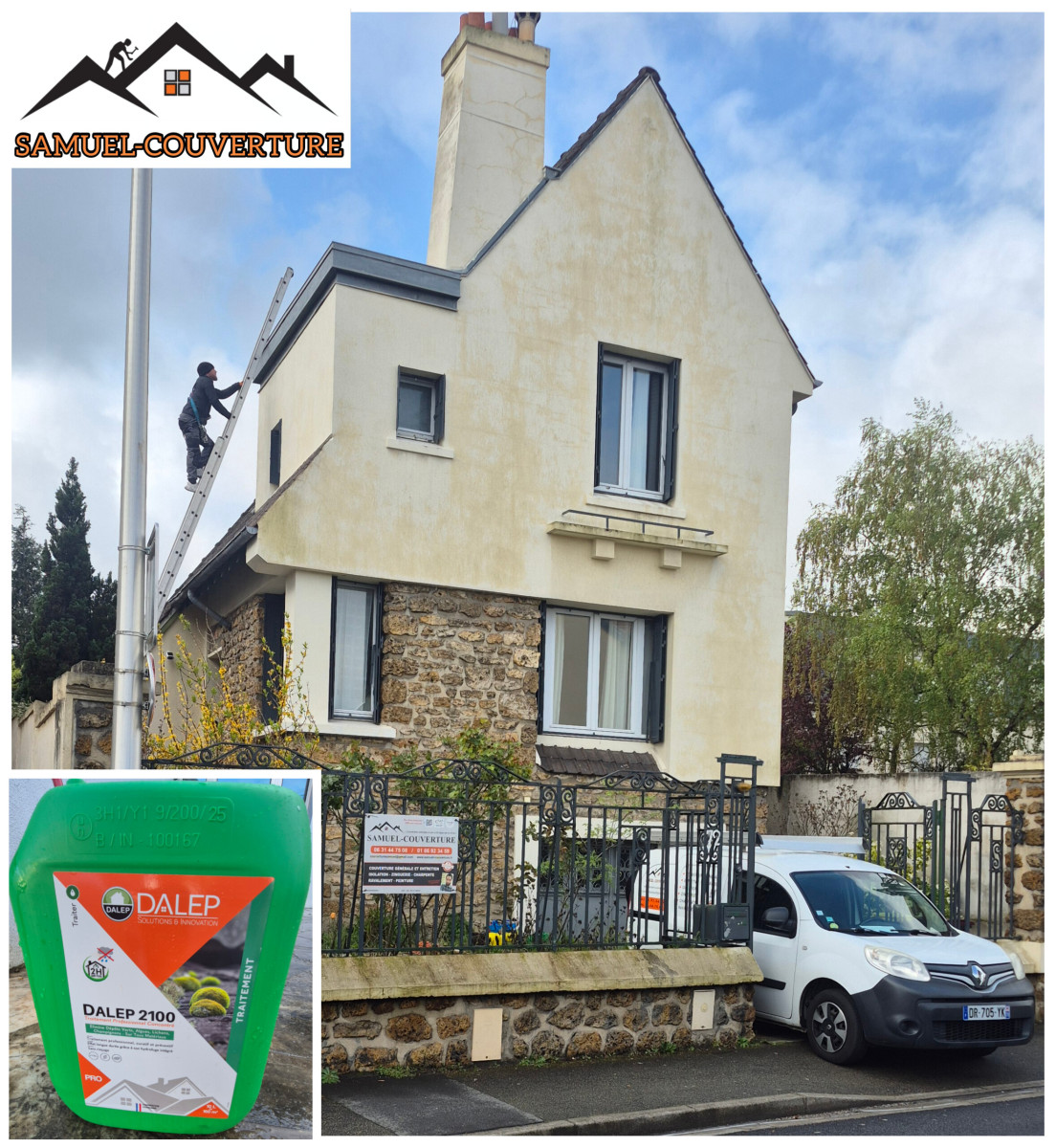 Aujourd'hui petit chantier à Villemomble en Seine-Saint-Denis : cimentation de la chaîne faîtière et traitement de la toiture par pulvérisation de DALEP2100 traitement tout en un nettoyant hydrofuge anti-mousse curatif et préventif.